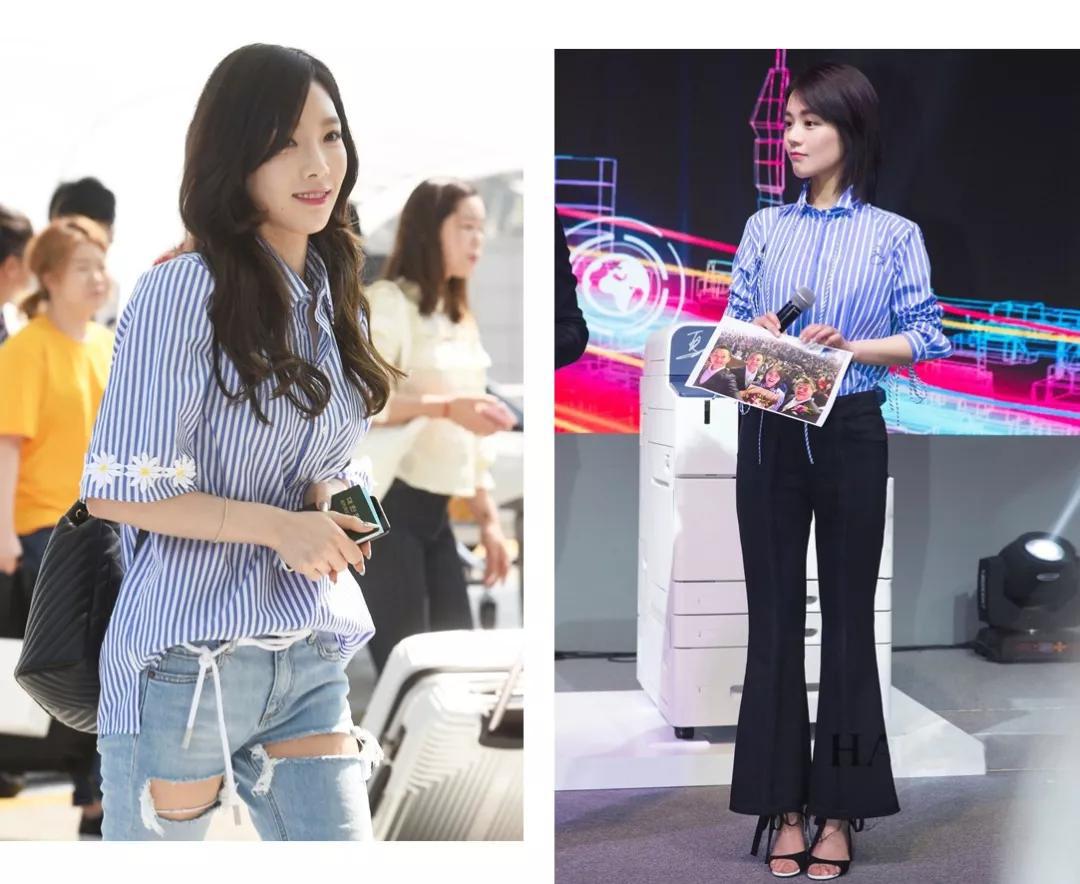 条纹元素经久不衰,疏密有致、蓝白相间的条纹衬衫,娴静文雅,竖条纹视觉上可以纵向延伸,所以还非常显瘦!