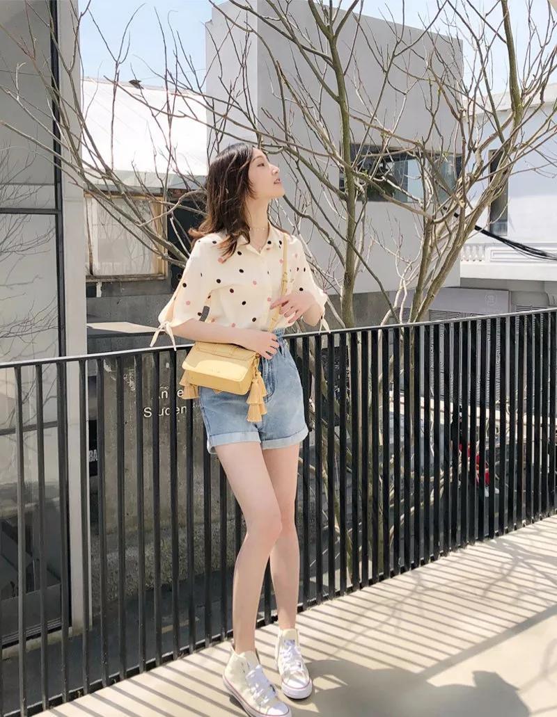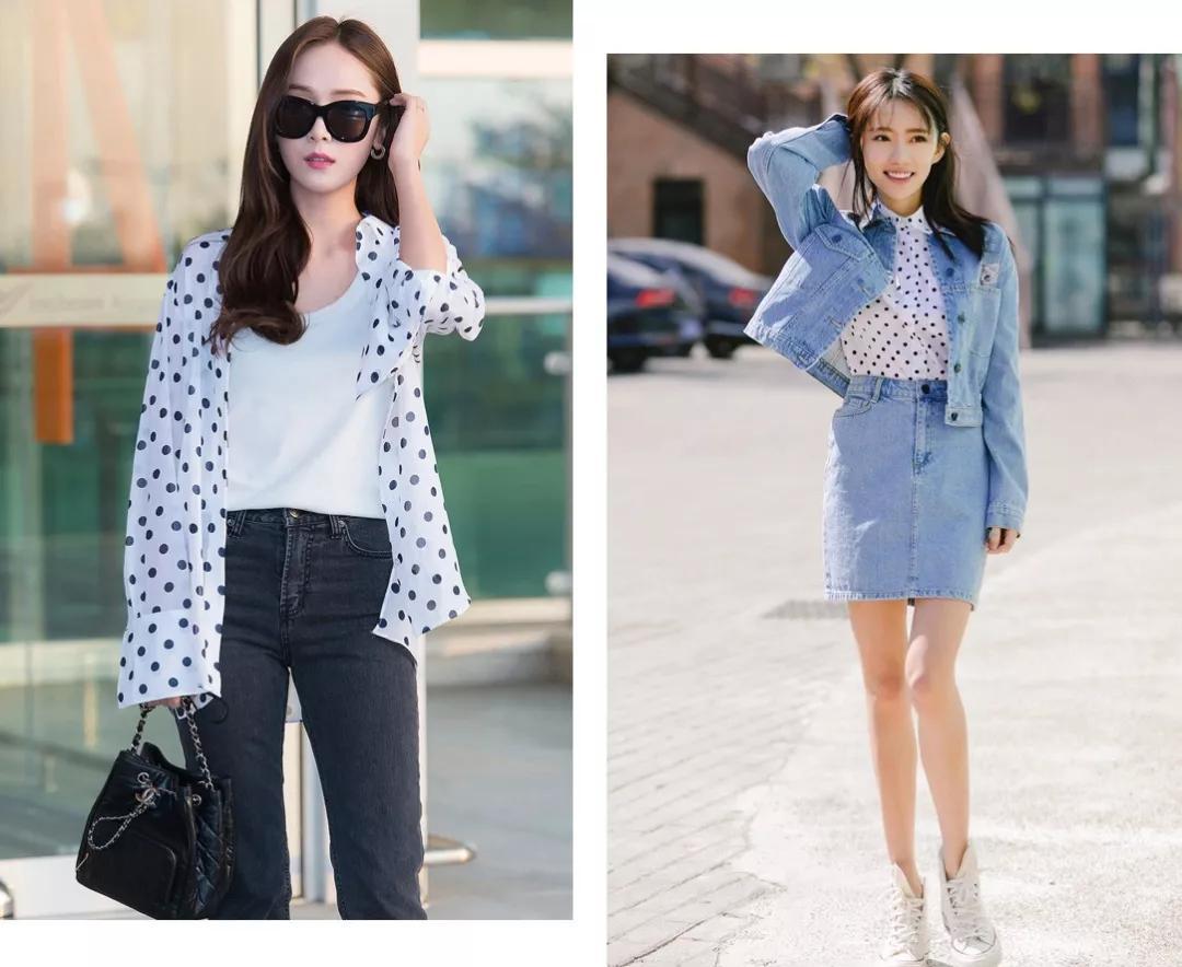 黑白波点衬衫,最经典复古的款式,月白风清般的雅致干净。天气如果再冷一点,搭配牛仔外套,也很清新秀气噢!