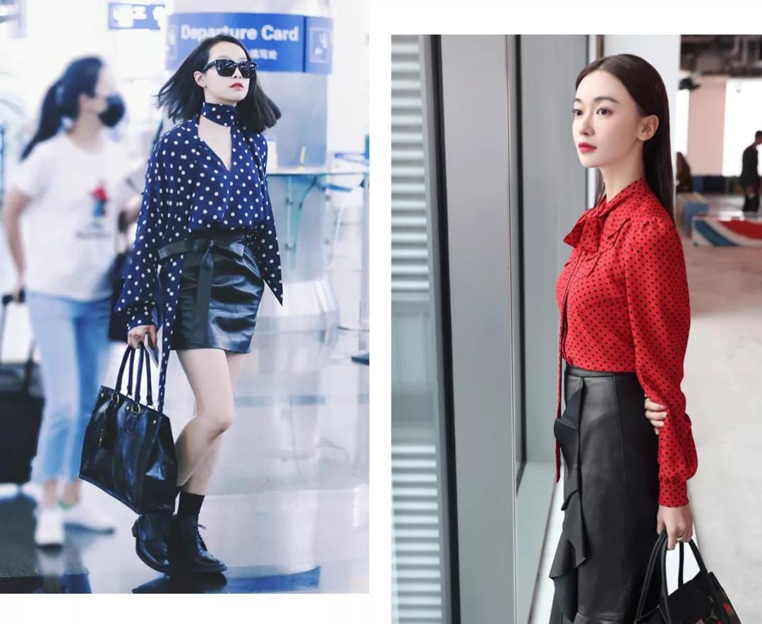 宋茜和吴谨言都选择用皮裙来配彩色波点衬衫,通过材质的差异来摆脱造型的平庸感。藏蓝和绛红都是优雅又霸气的颜色,显白能力max!